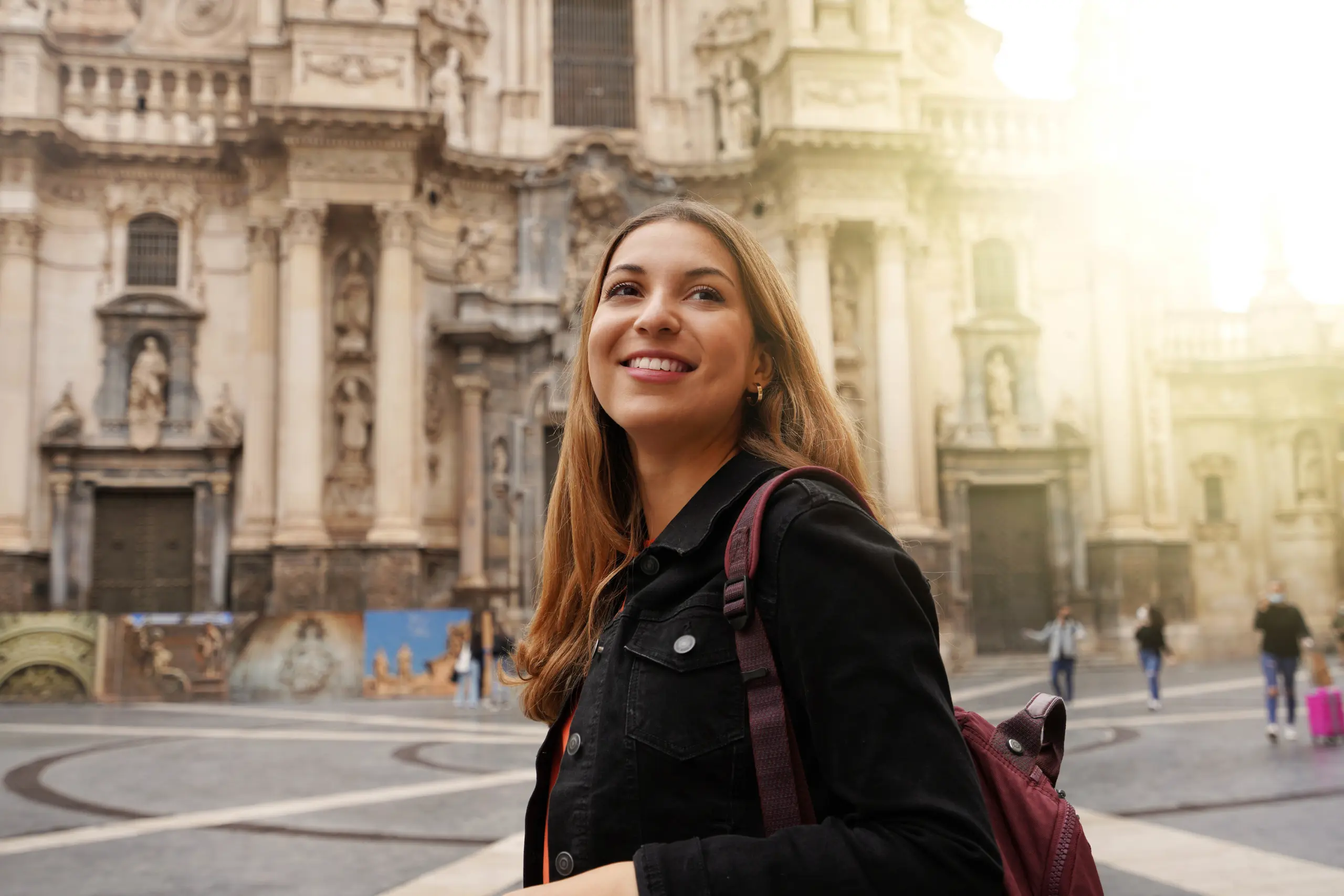 Jovem turista com mochila sorrindo em frente a catedral histórica europeia durante intercâmbio cultural