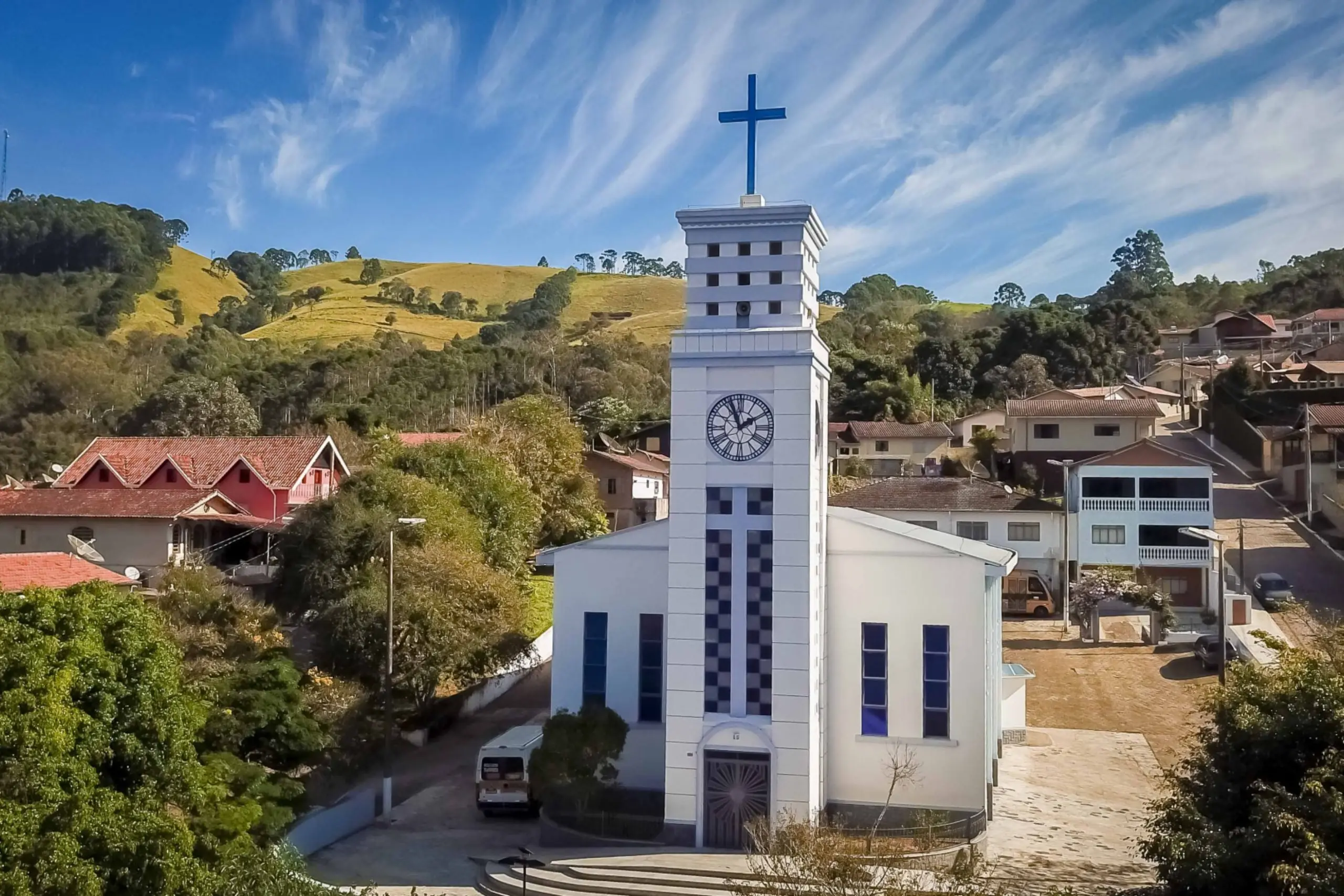 Vista aérea frontal da Igreja Matriz de Gonçalves, em Minas Gerais. A igreja é branca com detalhes em azul, possui uma torre central com relógio e uma cruz no topo. Ao fundo, colinas verdes e casas de telhado colonial sob um céu azul com nuvens alongadas.