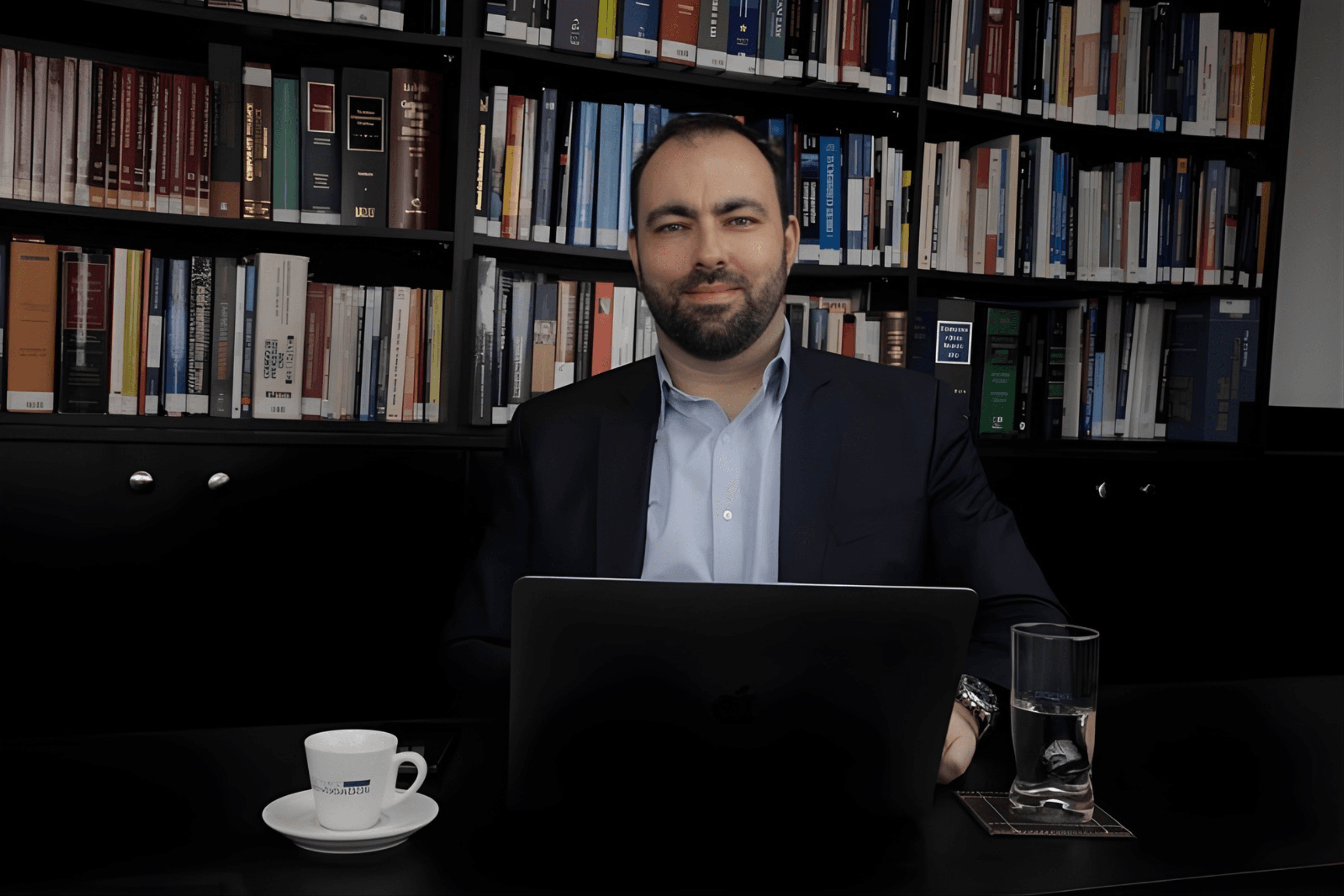Fernando Canutto, especialista em Direito Internacional Empresarial do Godke Advogados, sentado à mesa com estante de livros ao fundo